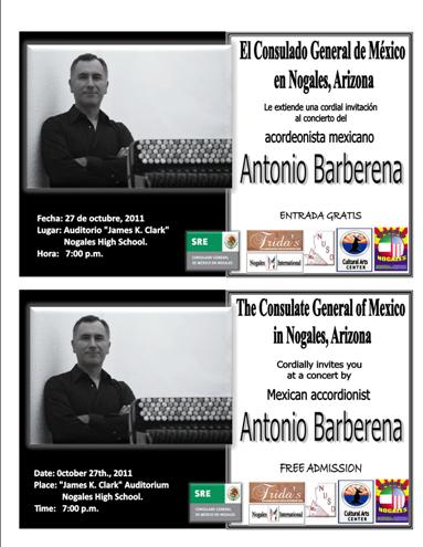 El 27 de octubre se presentó en el Auditorio “James K. Clark” de la Nogales High School, el acordeonista mexicano Antonio Barberena, ante una asistencia aproximada de 180 personas. Entre los asistentes se encontraban el Alcalde de Nogales Arizona, Arturo Garino y su esposa y los regidores Esther López y Nubar Hanessian, así como distinguidos miembros de la comunidad de ambos Nogales y una concurrencia de aproximadamente 180 persona.