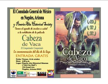 El 14 de octubre a las 6:00 p.m. se exhibió en las instalaciones de Pimería Alta Historical Museum (“Old City Hall”) la película “Cabeza de Vaca: el Conquistador Conquistado”.