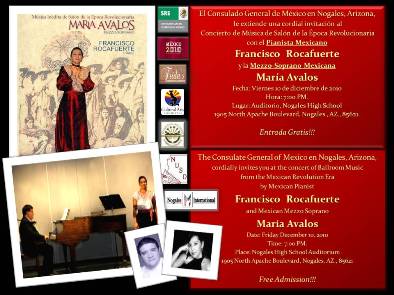 En el marco de las conmemoraciones del Bicentenario del Inicio de la Independencia y del Centenario del Inicio de la Revolución, se presentó en el Auditorio de la Nogales High School, un Concierto de Música de Salón de la Época Revolucionaria con el pianista Mexicano Francisco Rocafuerte y la Mezzo-Soprano Mexicana María Avalos, como evento culminante de las conmemoraciones del 2010, con el apoyo del Consulado General de México en Phoenix, del Comité de Arte y Cultura de Nogales, Arizona, Nogales Unified School District # 1” , la Cámara de Comercio de Nogales, Arizona, el Periódico “Nogales International ”.