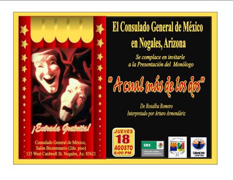 El jueves 18 de agosto a las 6:00 de la tarde se presento en el “Salón Bicentenario” de esta oficina consular el monólogo “A cual más de los dos”. Esta presentación, consiste en una sátira cómica sobre los padres de familia y la manera en la que los jóvenes llevan su vida en estos tiempos.