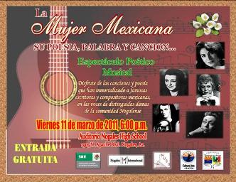 El viernes 11 de marzo, tuvo lugar en el Auditorio de la Nogales High School por segundo año consecutivo y en ocasión del “Día internacional de la Mujer” el Espectáculo Poético Musical La Mujer Mexicana, su Poesía, Palabra y Canciones, en el evento participaron damas de Nogales, Arizona y Nogales, Sonora, siendo un evento de carácter binacional, en el que participaron jóvenes de la clase de español de la Nogales High School con sus poesías, dando así impulso a los jóvenes.