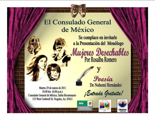 El 29 de marzo se llevó a cabo la presentación del monólogo “Mujeres Desechables”, por Rosalba Romero, y poesía de Nohemí Hernández, así como música a cargo de Caroline Crawford y Chris Burr, espectáculo en el cual se conjugó la poesía, la música y el teatro.