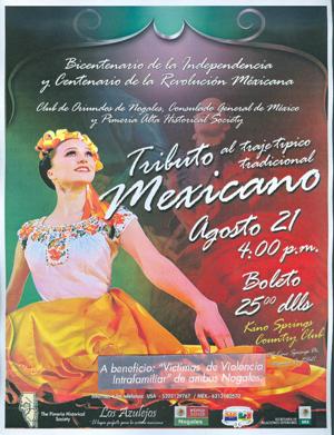 El 21 de agosto, con motivo de la celebración del Inicio el Bicentenario Del Inicio de la Independencia y Centenario del inicio de la Revolución, el Club de Oriundos “Nogalenses en Arizona”, “Pimería Alta Historica Society” con el apoyo del Consulado General De México, presentaron “Tributo al Traje Tradicional Mexicano”en el cual se presentaron trajes típicos de diferentes regiones de México, portados orgullosamente por damas de Nogales. El evento se organizó a beneficio de “Victimas de Violencia Intrafamiliar” de ambos Nogales.