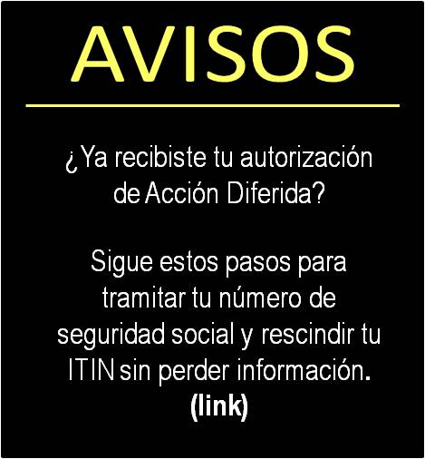 | El 15 de Junio del 2012, la Secretaria del Departamento de Seguridad Nacional (DHS, por sus siglas en inglés) anunció que ciertas personas que llegaron a los Estados Unidos siendo niños y cumplen ciertos requisitos específicos pueden solicitar ser considerados a la Acción Diferida por un período de dos años, sujeto a renovación, y entonces ser elegibles para la autorización de empleo. | ||