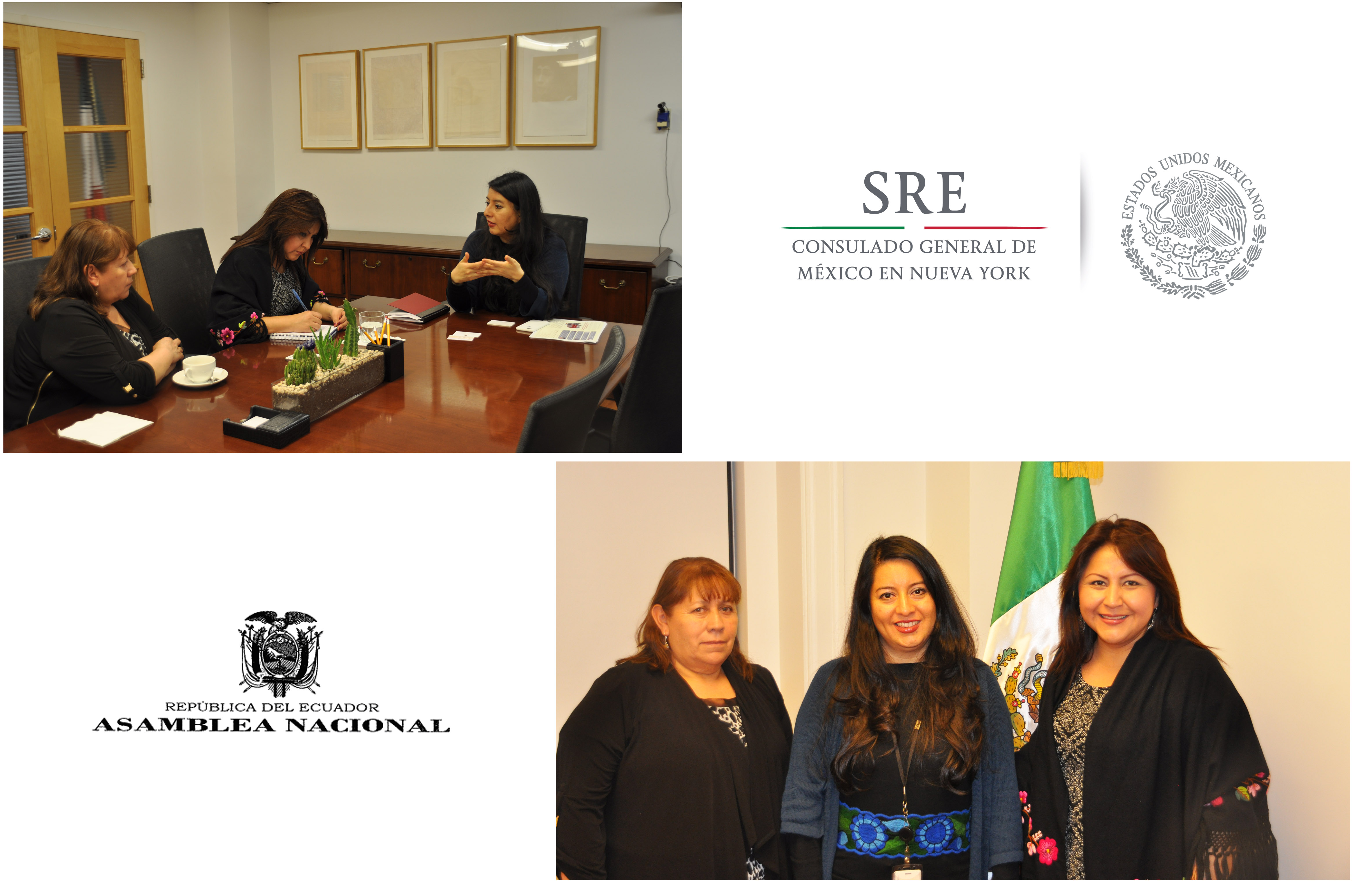 El pasado viernes 24 de febrero por la tarde, la Cónsul Adscrita del Consulado, Vívian Juárez Mondragón, en representación del Cónsul General, Diego Gómez Pickering, sostuvo un encuentro con la Asambleísta de la República del Ecuador por la Circunscripción de los E.E.U.U. y Canadá, Ximena Peña Pacheco, en compañía de la Presidenta de “Compañeros Unidos por un Nuevo Amanecer (CUNANY, Inc.)”, Cecilia Diez.