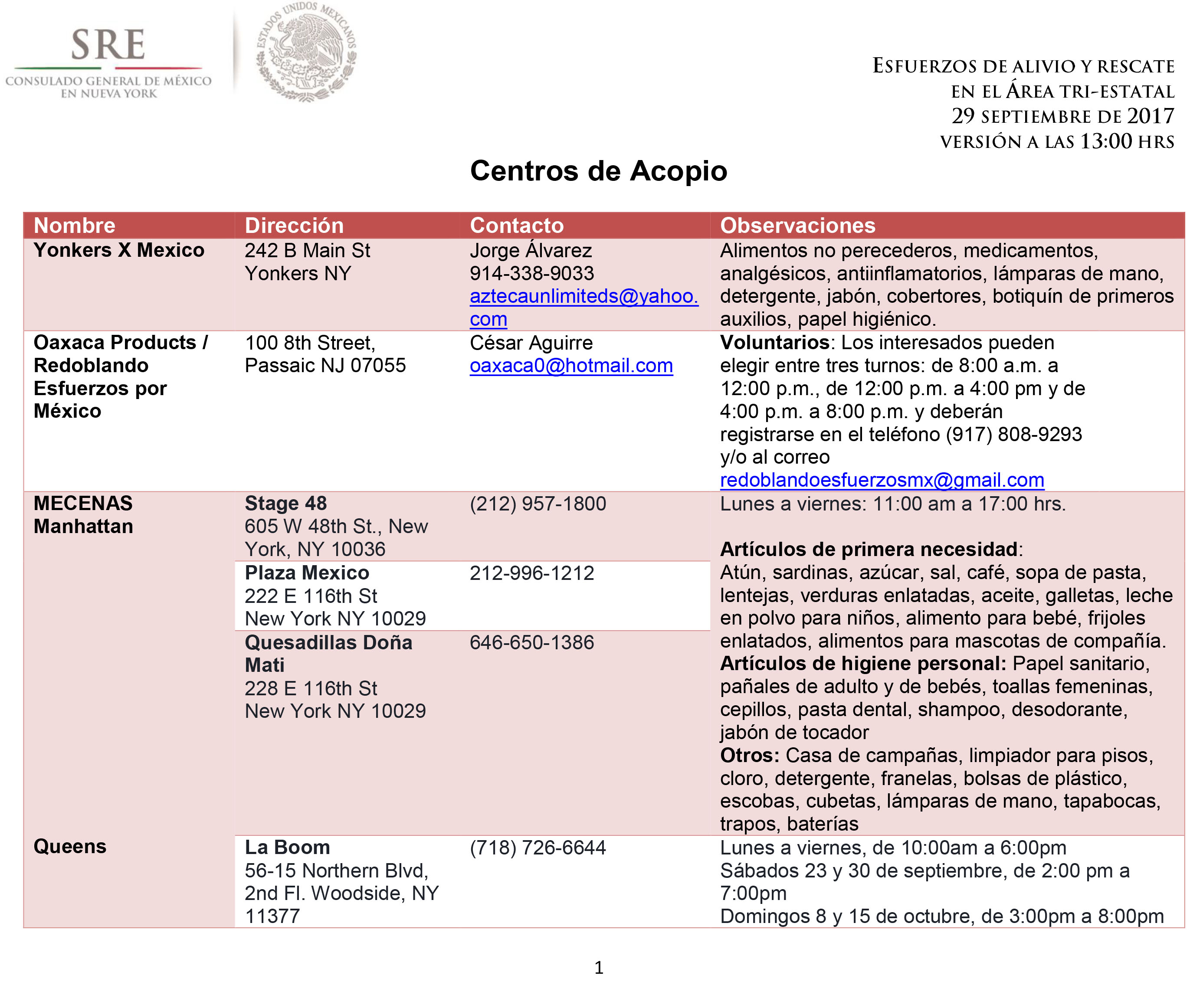 El Consulado General de México en Nueva York, agradece las muestras de solidaridad con las víctimas de los sismos registrados en territorio mexicano el pasado 19 de septiembre con magnitud de 7.1 grados y el pasado 7 de septiembre con magnitud 8.2 grados en la escala de Richter.