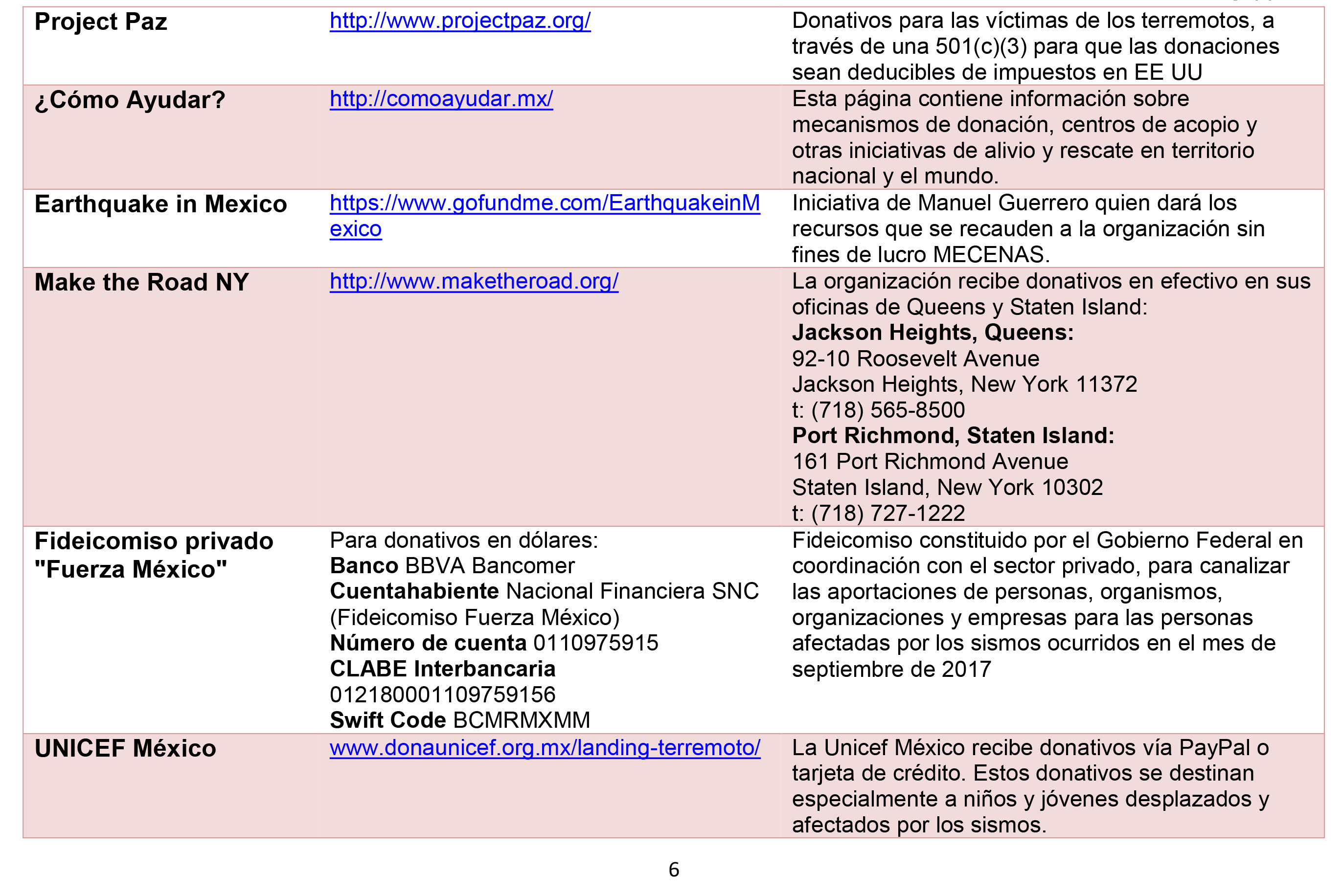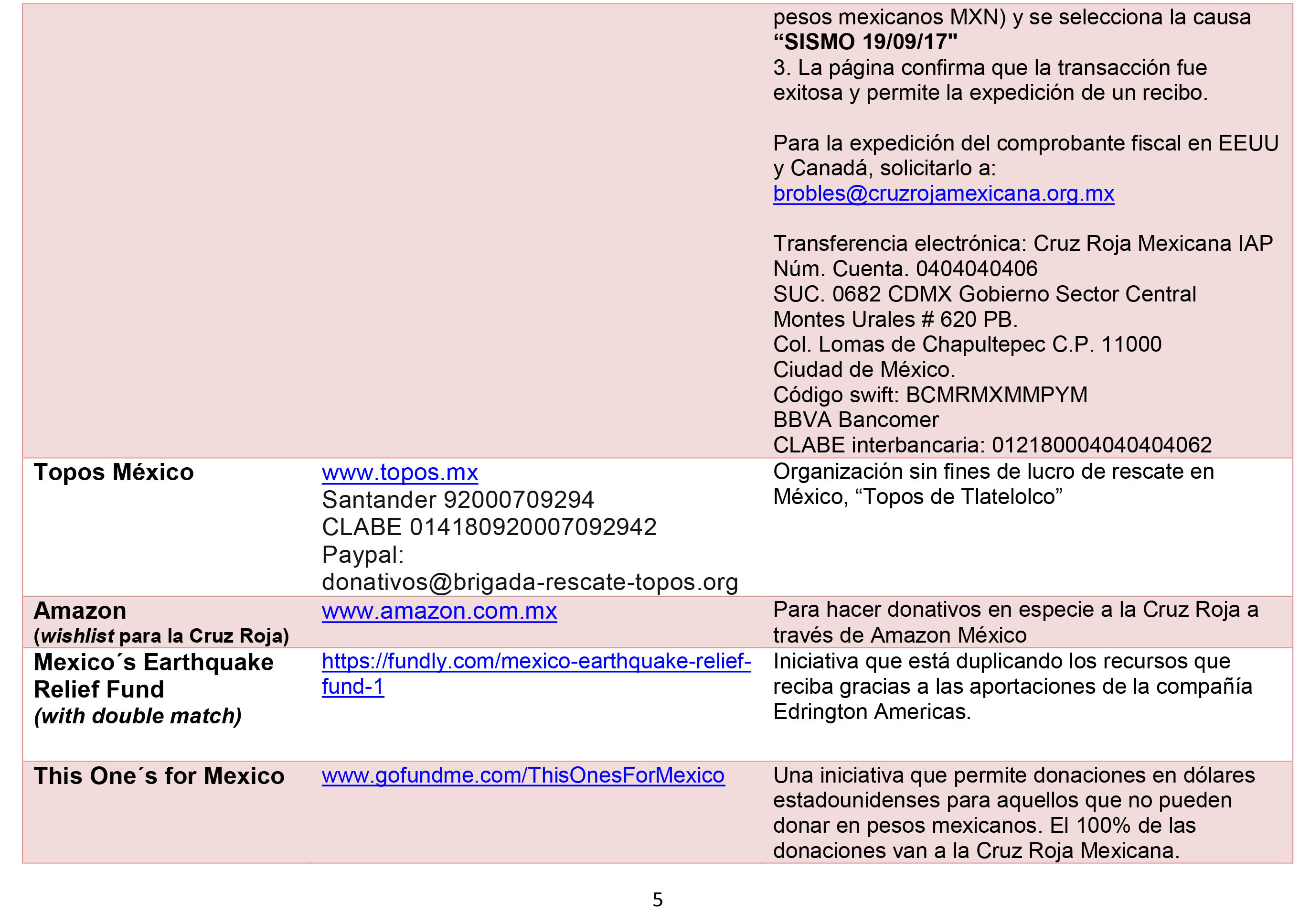 1. Las donaciones se podrán realizar a través de la Cruz Roja Mexicana mediante su sitio web https://cruzrojadonaciones.org/. Los pasos para hacerlos son: i. Entrar a la página y se capturan los siguientes datos para crear una cuenta. ii. Se capturan los datos de la tarjeta de crédito o a través de una cuenta PAYPAL (la cantidad es en pesos mexicanos MXN) y se selecciona la causa “SISMO 19/09/17" iii. La página confirma que la transacción fue exitosa y permite la expedición de un recibo. 2. Para quienes deseen donar en especie, lo pueden hacer a través de empresas globales como Amazon en la página https://www.amazon.com.mx/. Los pasos a seguir son: i. Entrar a la página y seleccionar "Fuerza México. Donar y ayudar nos une". ii. Escoger la opción "Cruz Roja Mexicana". Ahí encontrarán una "wishlist" que se actualiza en tiempo real de acuerdo con las necesidades de la Cruz Roja, así como las instrucciones en donde se explica cómo hacer el donativo paso a paso. 3. Dado que en la siguiente etapa se enfocarán los esfuerzos en la reconstrucción, el sector privado creo el fideicomiso “FUERZA MEXICO” en el cual participarán líderes de las principales cámaras empresariales para acompañar en las acciones de reconstrucción en los Estados que fueron afectados por los sismos recientes. Al respecto, se envían los datos para las transferencias internacionales: Cuenta Clabe Pesos Mexicanos / Number Account Mexican Pesos: 012180001109759075 O Cuenta Clabe Dólares Americanos / Numbre Account USD: 012180001109759156 Para ambas cuentas: Razón Social / Name Account: NACIONAL FINANCIERA SNC COMO FID DEL F 80755 FUERZA MEXICO Swift: BCMRMXMM Banco / Bank: BBVA Bancomer Sucursal / Branch: 0095 Dirección / Adress: Av. Paseo de la Reforma N. 510 Col. Juárez, CP 06600 ------ Si necesitas ayuda para localizar un familiar, la Cruz Roja Mexicana pone a su disposición el programa de Restablecimiento del Contacto entre Familiares para apoyar a las personas que hayan perdido contacto con algún familiar en la Ciudad de México. Podrán hacerlo a través de los teléfonos 10844517 y 10844795 o acudiendo directamente al helipuerto de Cruz Roja Mexicana ubicado en Ejército Nacional núm. 1032, donde se instalará una mesa para recibir solicitudes. También se informa que el Servicio de Administración Tributaria (SAT) ha tomado una serie de medidas para facilitar el ingreso de donaciones del extranjero a nuestro país: https://www.gob.mx/sat/prensa/com2017_101?idiom=es .