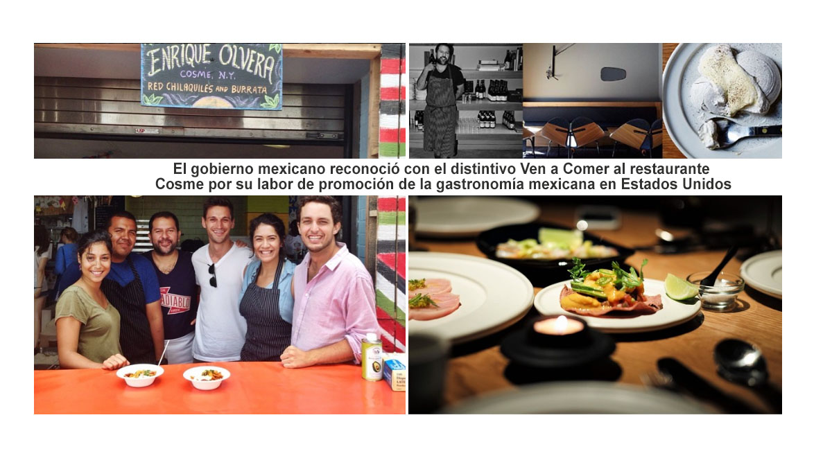 El pasado jueves 16 de junio, la Canciller Claudia Ruiz Massieu otorgó los primeros cinco distintivos Ven a Comer a destacados restaurantes en el extranjero que promueven la gastronomía mexicana, entre los que se encuentra el restaurante Cosme del reconocido chef mexicano Enrique Olvera, ubicado en Nueva York.