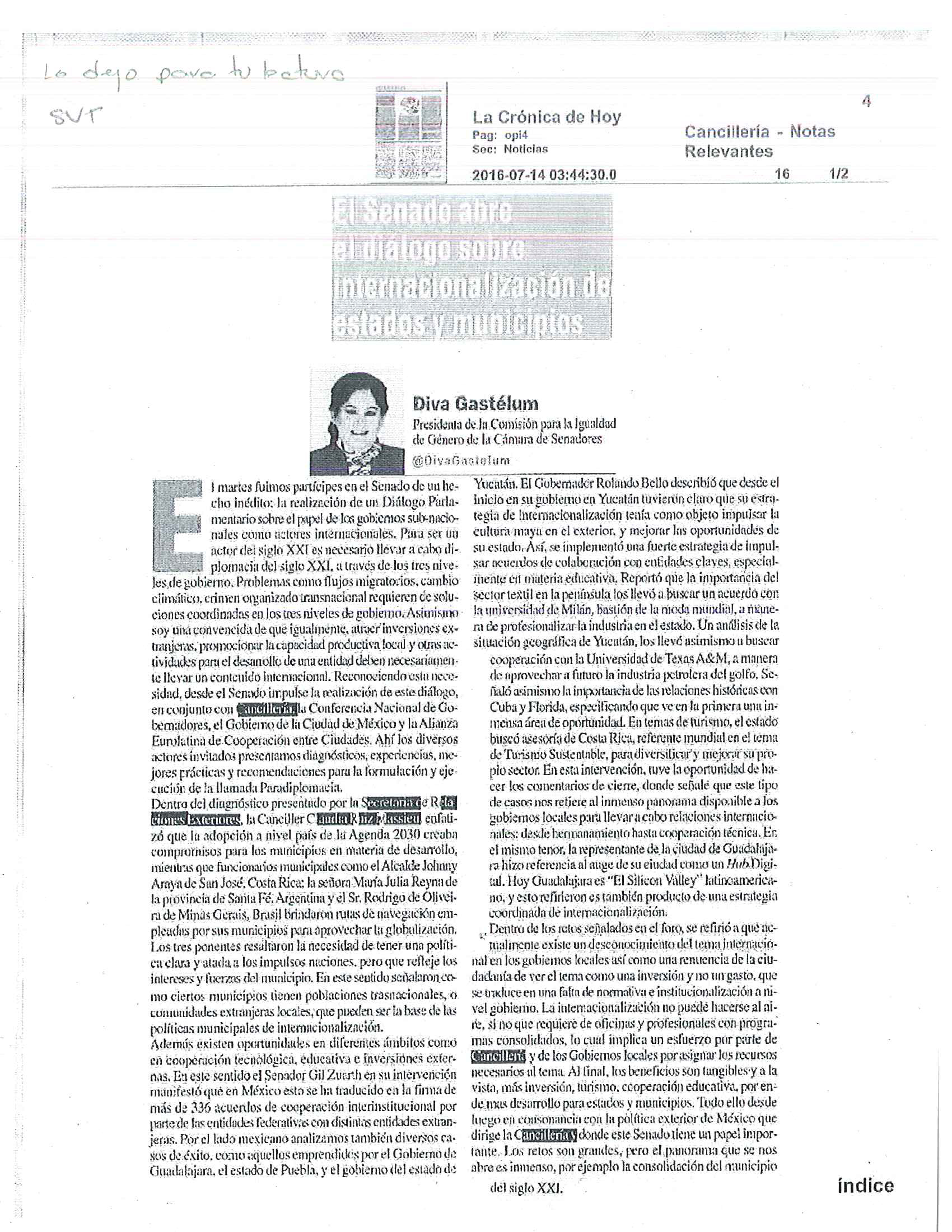 - Mensaje de la Canciller en el Diálogo Parlamentario sobre el papel de los gobiernos sub-nacionales como actores internacionales