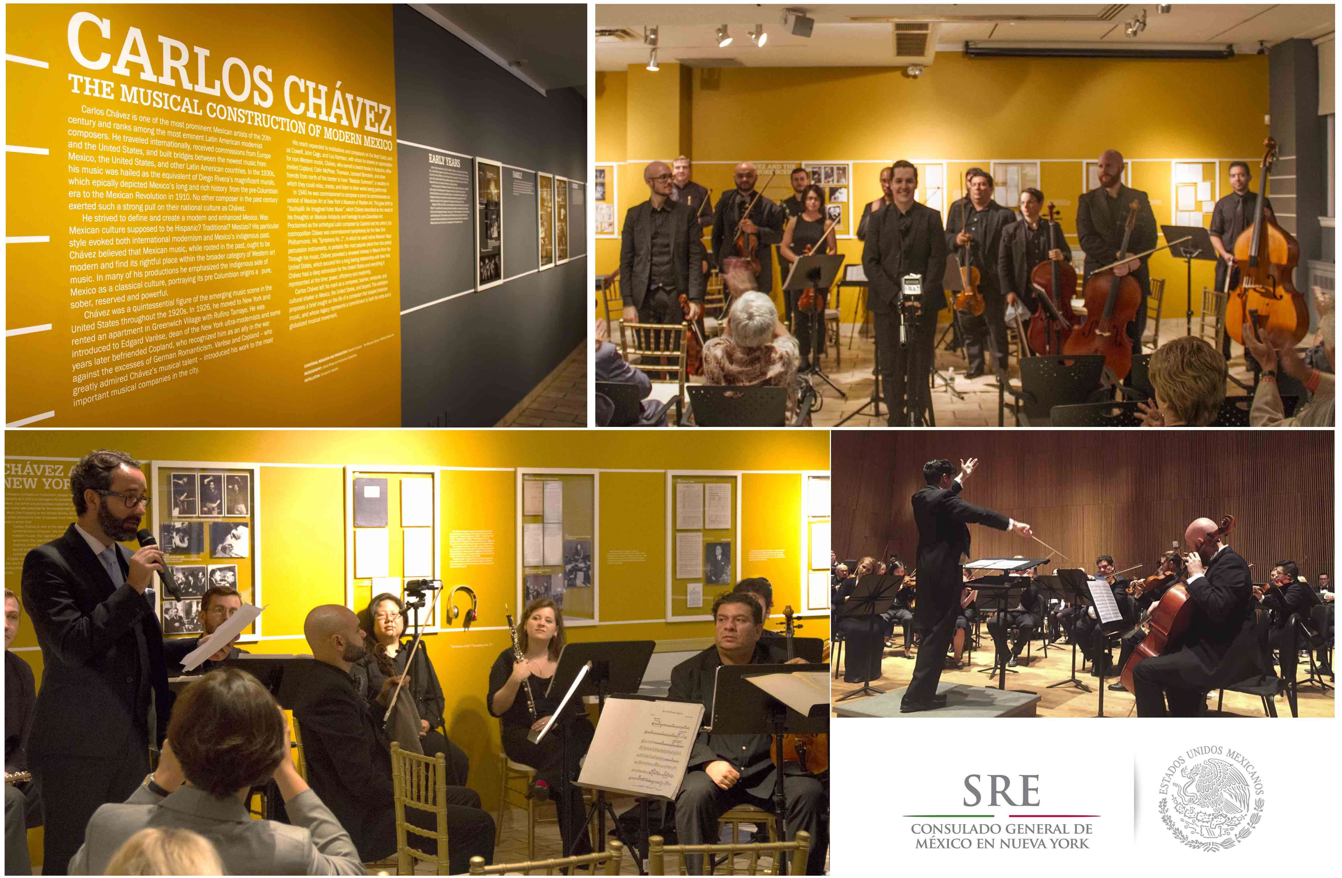 La exposición Carlos Chávez: The Musical Construction of Modern Mexico, que se exhibe en la Galería Octavio Paz del Consulado General de México en Nueva York, recorre la vida personal y profesional de Chávez resaltando sus estancias en Nueva York, su relación con diferentes instituciones musicales estadounidenses como la Filarmónica de Nueva York y su concierto presentado en el Museo de Arte Moderno de Nueva York (MoMA) en 1940 en el marco de la exposición “Veinte siglos de arte mexicano”. Las fotografías y documentos que integran la muestra provienen del archivo de la familia Chávez.