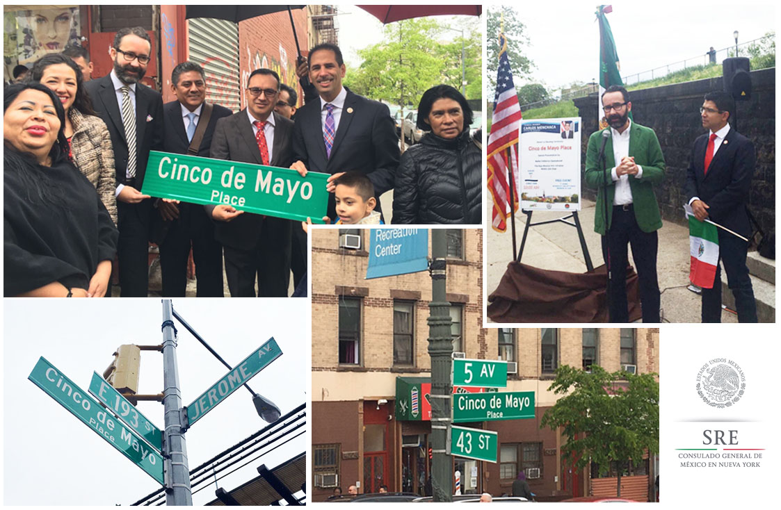 El viernes 5 de mayo, el Cónsul General de México en Nueva York, Diego Gómez Pickering, junto al concejal Fernando Cabrera y a Jairo Guzmán, Presidente de la Coalición Mexicana para el Empoderamiento de los Jóvenes y sus Familias, develaron la placa “5 de Mayo Place”, en la intersección de Jerome Avenue y 193rd Street en el Bronx. De este modo, la comunidad mexicana, el Gobierno de México y las autoridades locales fortalecieron lazos de amistad y solidaridad en beneficio de nuestros connacionales. Cabe destacar que estuvieron presentes, la Diputada Maritza Marin, del Congreso del Estado de Puebla; Ana Flores, Directora Ejecutiva de Mi Casa es Puebla Passaic|NY; y Ernesto Leyva, líder comunitario de dicha zona, entre otros.