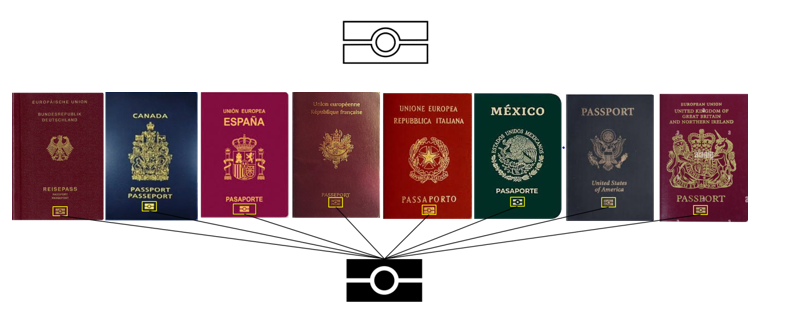 Todos los pasaportes electrónicos tienen en la parte inferior media de la portada un símbolo que lo identifica como un pasaporte electrónico: