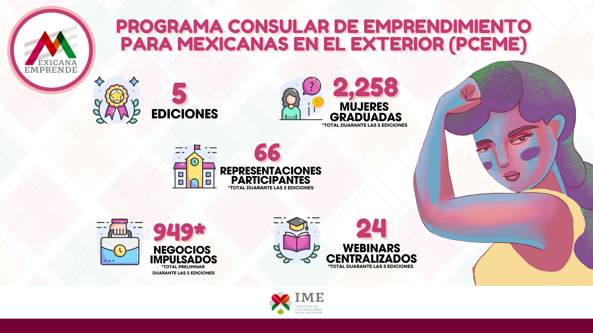 A lo largo de cinco ediciones, el PCEME ha consolidado un significativo número de mujeres graduadas, quienes son dueñas de sus propios negocios y, además, son agentes de cambio en el país en el que residen y son fuente de inspiración para su familia, su comunidad. Para el IMME, esta iniciativa ha permitido destacar la relevancia de las mexicanas en el contexto de la migración, donde muchas han logrado con esfuerzo ingresar al ámbito del emprendimiento.