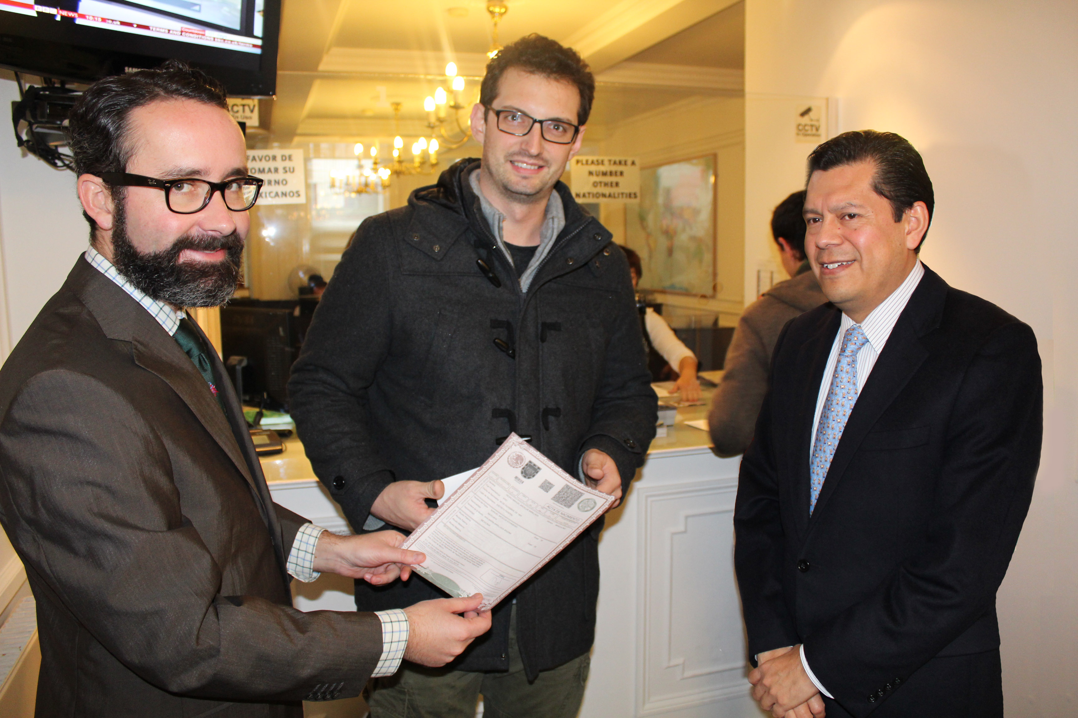 El Embajador de México en el Reino Unido, Diego Gómez Pickering y el Titular de la Sección Consular, Aníbal Gómez Toledo, entregaron las primeras copias certificadas a connacionales que residen en Londres, resaltando la importancia de este nuevo servicio para la población mexicana en el exterior anunciado por el Presidente Enrique Peña Nieto el 5 de enero de 2015.