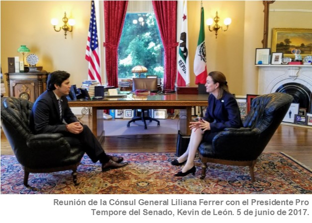 La Cónsul General ha sostenido más de 80 reuniones de trabajo con actores políticos de la circunscripción, destacando reuniones con el Gobernador Edmund G. Brown y los líderes de la Legislatura, donde subrayó la importancia de trabajar conjuntamente y establecer una relación positiva con los legisladores de ambos partidos.