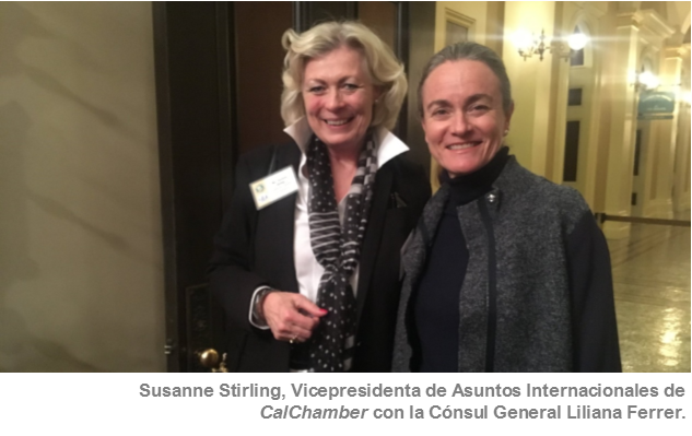 En el marco de la renegociación del Tratado de Libre Comercio de América del Norte (TLCAN), el 8 de noviembre de 2017, se sostuvo una reunión con Susanne Stirling, Vicepresidenta de Asuntos Internacionales de la Cámara de Comercio de California (CalChamber) con la finalidad de dialogar sobre la carta enviada el 12 de octubre al Presidente Donald Trump, en apoyo al TLCAN y su proceso de modernización. Esta carta fue suscrita el 10 de octubre de 2017 por 300 Cámaras de Comercio estatales y locales de todo Estados Unidos y por 52 cámaras de comercio locales de California.