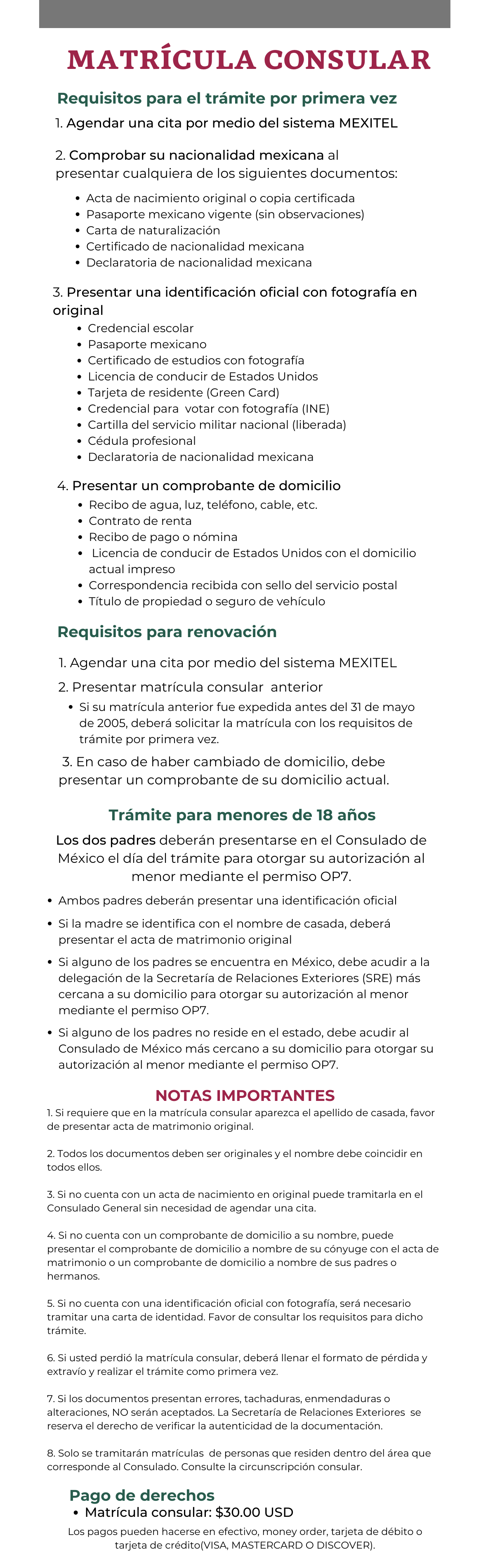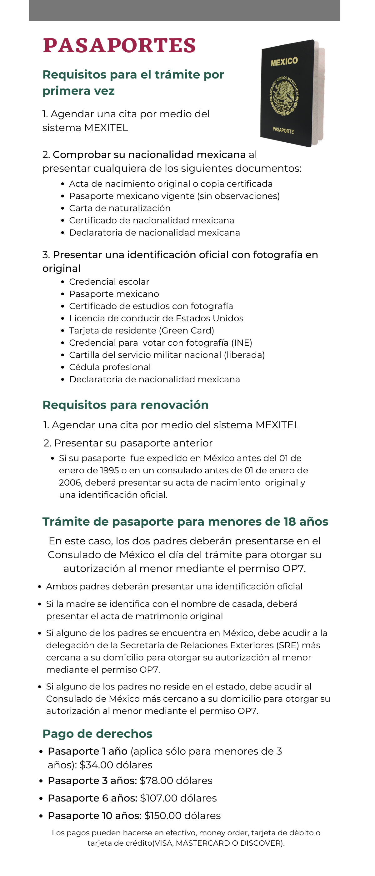 REQUISITOS RENOVACIÓN 1. Usted debe hacer una cita en Mexitel. 2. Presentar su Pasaporte anterior. Si su pasaporte fue expedido en México antes del 01 de enero de 1995, o en un consulado antes de 01 de enero de 2006. Se requiere presentar Acta de nacimiento en original y una identificación oficial. NOTAS IMPORTANTES: 1. No se aceptan actas de nacimiento extemporáneas, si su acta de nacimiento es extemporánea deberá presentar una prueba complementaria. 2. Si requiere que el pasaporte aparezca el apellido de casada, favor de presentar acta de matrimonio original. 3. No se aceptan copias de documentos, debe presentar documentos en originales, y tiene que coincidir (ser iguales) el Nombre y Apellido en el acta de nacimiento e identificación oficial. 4. Si no cuenta con un acta de nacimiento en original, el Consulado General de México en San Antonio Texas, puede proporcionar su acta original, Nota: No todas las actas están disponible. Para este trámite no necesita hacer una cita. 5. Si no cuenta con ninguna identificación oficial, será necesario tramitar una carta de identidad. 6. Si usted perdió su Pasaporte y estaba vigente, debe ser reportado al departamento de Policía. 7. Si el acta de nacimiento o matrimonio presenta errores, tachaduras o alteraciones, No será aceptada. MENORES DE 18 AÑOS En caso de ser menor de 18 años, los dos padres deberán presentarse en el Consulado de México el día del trámite para otorgar su autorización al menor mediante el permiso OP7. 1. Ambos padres deberán presentar una identificación oficial. 2. Si la madre se identifica con el nombre de casada, debe presentar al acta de matrimonio en original. 3. Si alguno de los padres se encuentra en México, debe acudir a la delegación de la Secretaría de Relaciones Exteriores (SRE) más cercana a su domicilio para otorgar su autorización al menor mediante el permiso OP7. La atención de este Consulado para OP7 es de lunes a viernes con horario de atención de 8:30 a.m. a 1:00 p.m. 4. Si alguno de los padres no reside en el Estado, debe acudir al Consulado de México más cercano a su domicilio para otorgar su autorización al menor mediante el permiso OP7. 5. Para menores de 3 años la identificación puede ser su carta de vacunación con sello oficial de la institución, entre el documento y la foto. 6. Para menores de 17 años la identificación puede ser su la credencial de la escuela con foto, si en la escuela no manejan credencial con foto, deberá solicitar su constancia de estudios con foto y un sello de la institución escolar entre el documento y la foto. 7. Presentar acta de Nacimiento original para el trámite de renovación o primera vez.