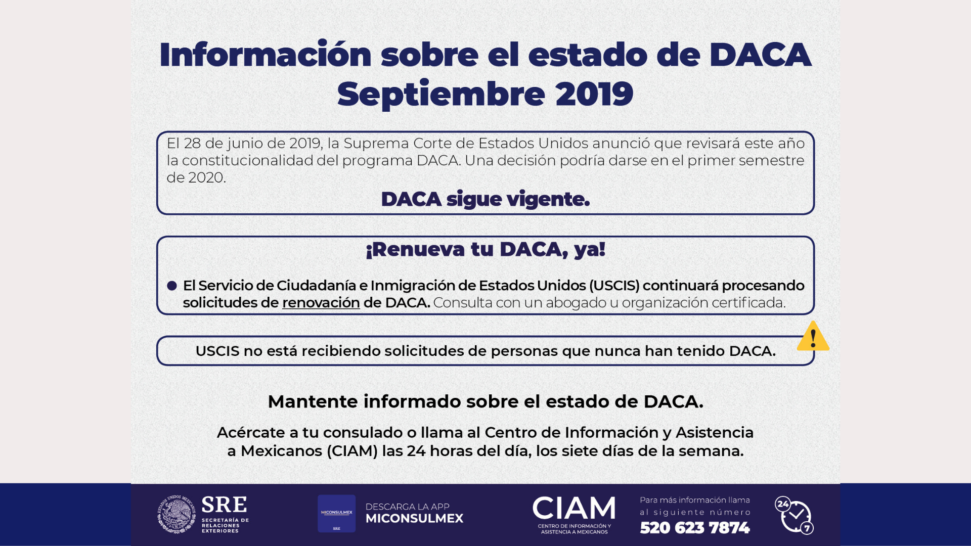 ?¡El programa DACA sigue vigente!? Aunque no se están procesando neuvas solicitudes, el Servicio de Ciudadanía e Inmigración de EE.UU. sigue continúa tramitando solicitudes de renovación. ¡Infórmate y renueva tu DACA! ?️