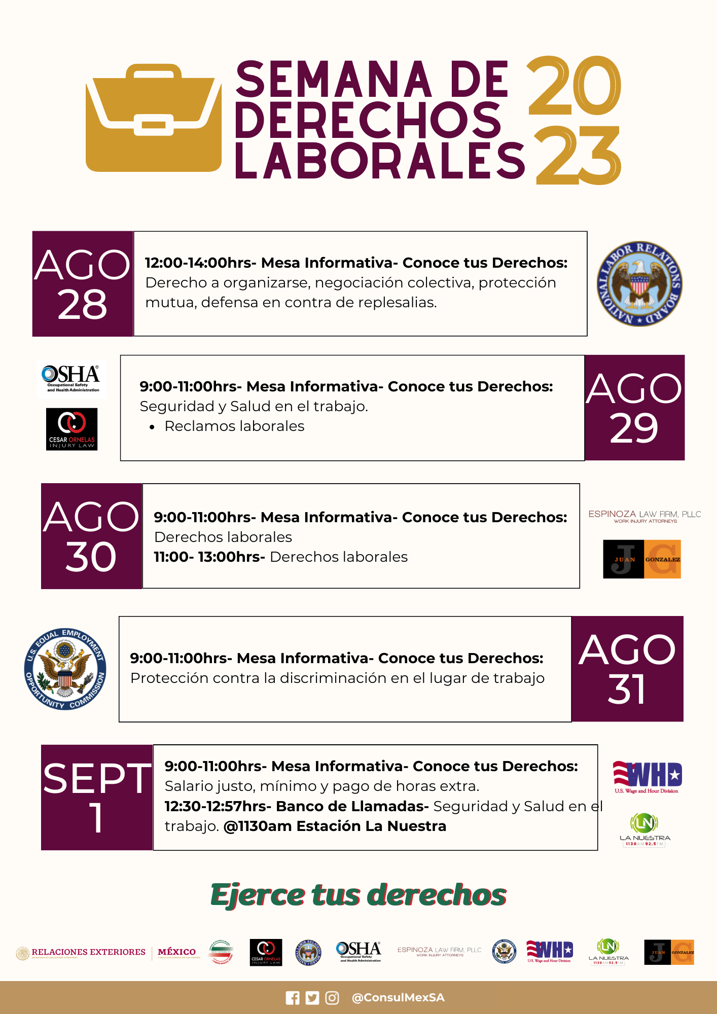 La Semana de Derechos Laborales #SDL2023 es una oportunidad invaluable para fomentar conciencia, entendimiento y acción en torno a los derechos de nuestros connacionales en su lugar de trabajo. Ya seas trabajador, empleador o simplemente un ciudadano interesado en la justicia social, esta semana te brinda información para aprender, reflexionar y tomar medidas concretas para un futuro laboral más equitativo y respetuoso.