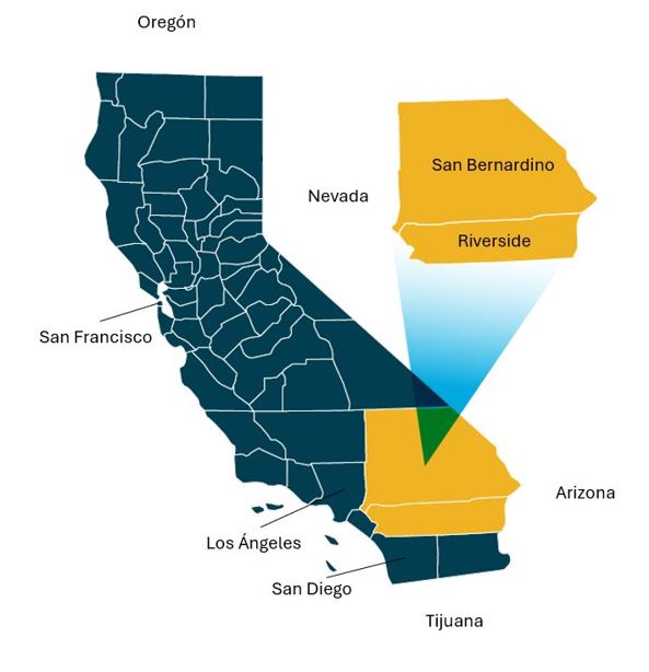 El Inland Empire, región del interior, adyacente a la costa sur de California, en el área metropolitana de Los Ángeles, colinda al oeste con los condados de Kern, Los Ángeles y Orange; al sur con los condados de San Diego e Imperial; al norte con los condados de Inyo y Kern; y al este con los estados de Nevada y Arizona.