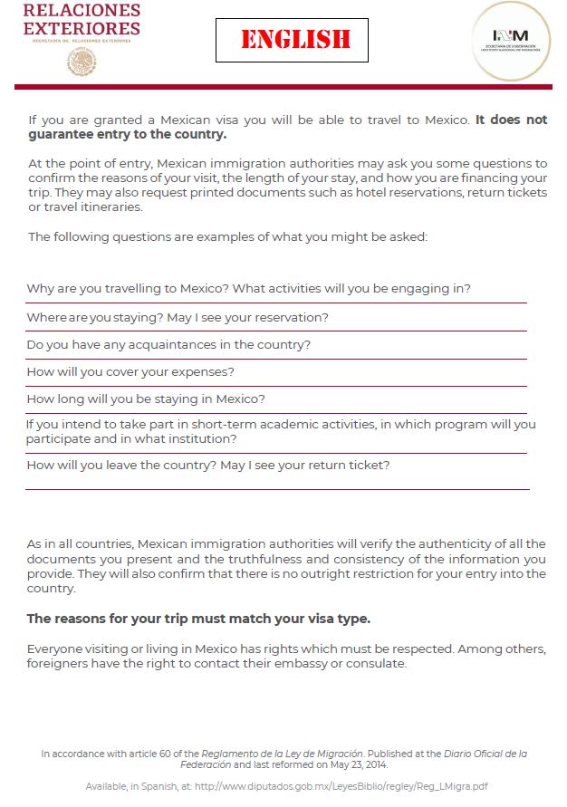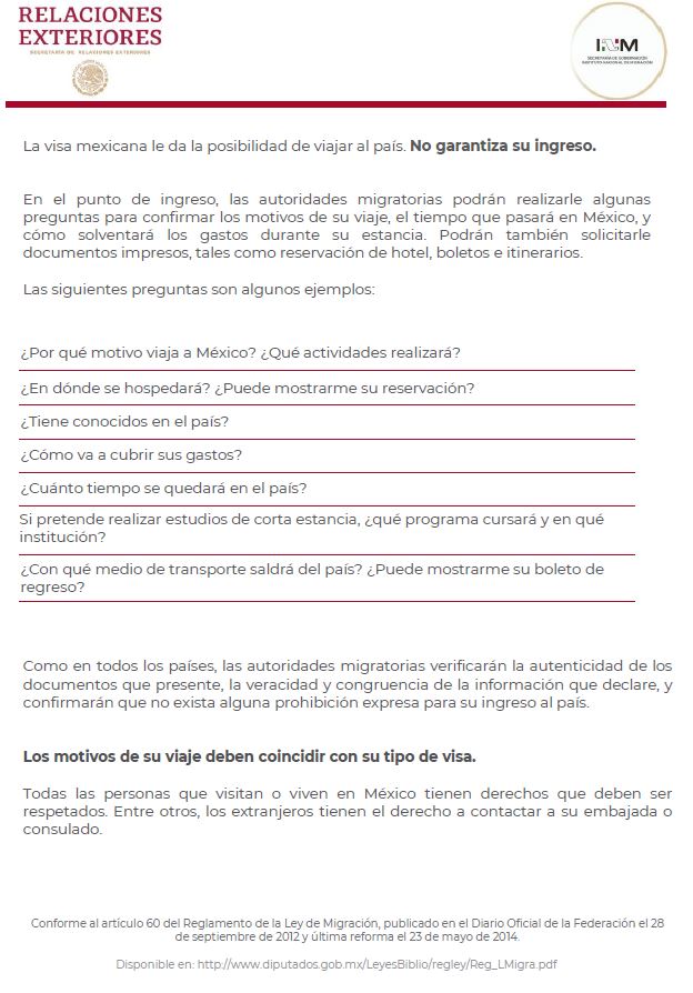 - The displaying of the documents does not guarantee the visa approval/issuance. As the visa itself, does not guarantee the admission to Mexican territory. The admission to Mexico is subject to approval by the immigration authorities in the position intended for international movement of people.