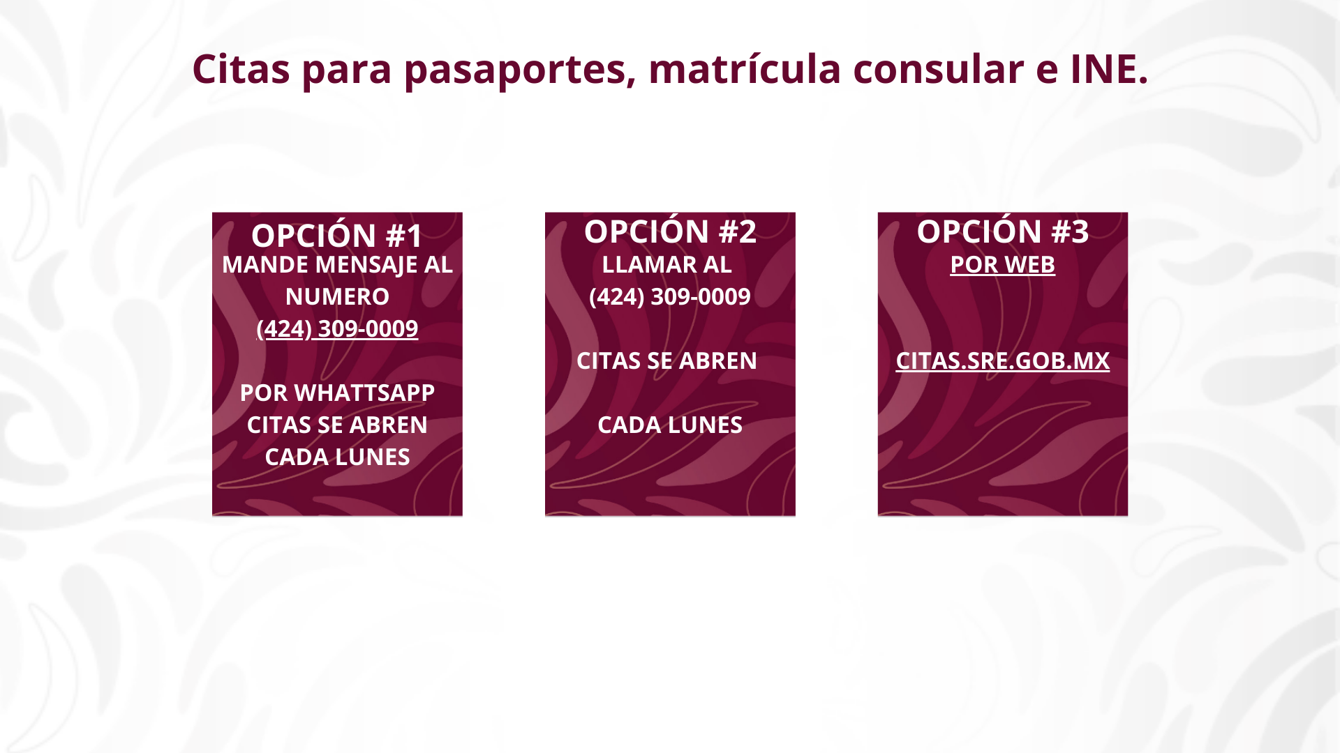 Programa tu cita en el portal de Citas SRE (https://citas.sre.gob.mx/) o a través de MiConsulado vía telefónica o WhatsApp al número +1 (424) 309-0009. Recuerda que éstos son los únicos medios oficiales autorizados para programación de citas.