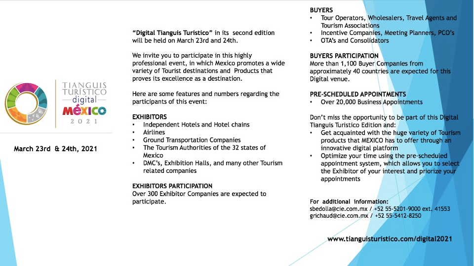 Given the prevailing uncertainty, postponing this event, that is the main tourism event in Mexico and Latin America, will allow mobility to normalize and will help participants to be in optimal conditions to conduct business in a face-to-face format. Preserving the health of attendees, both national and foreign, as well as the local population, is the priority.