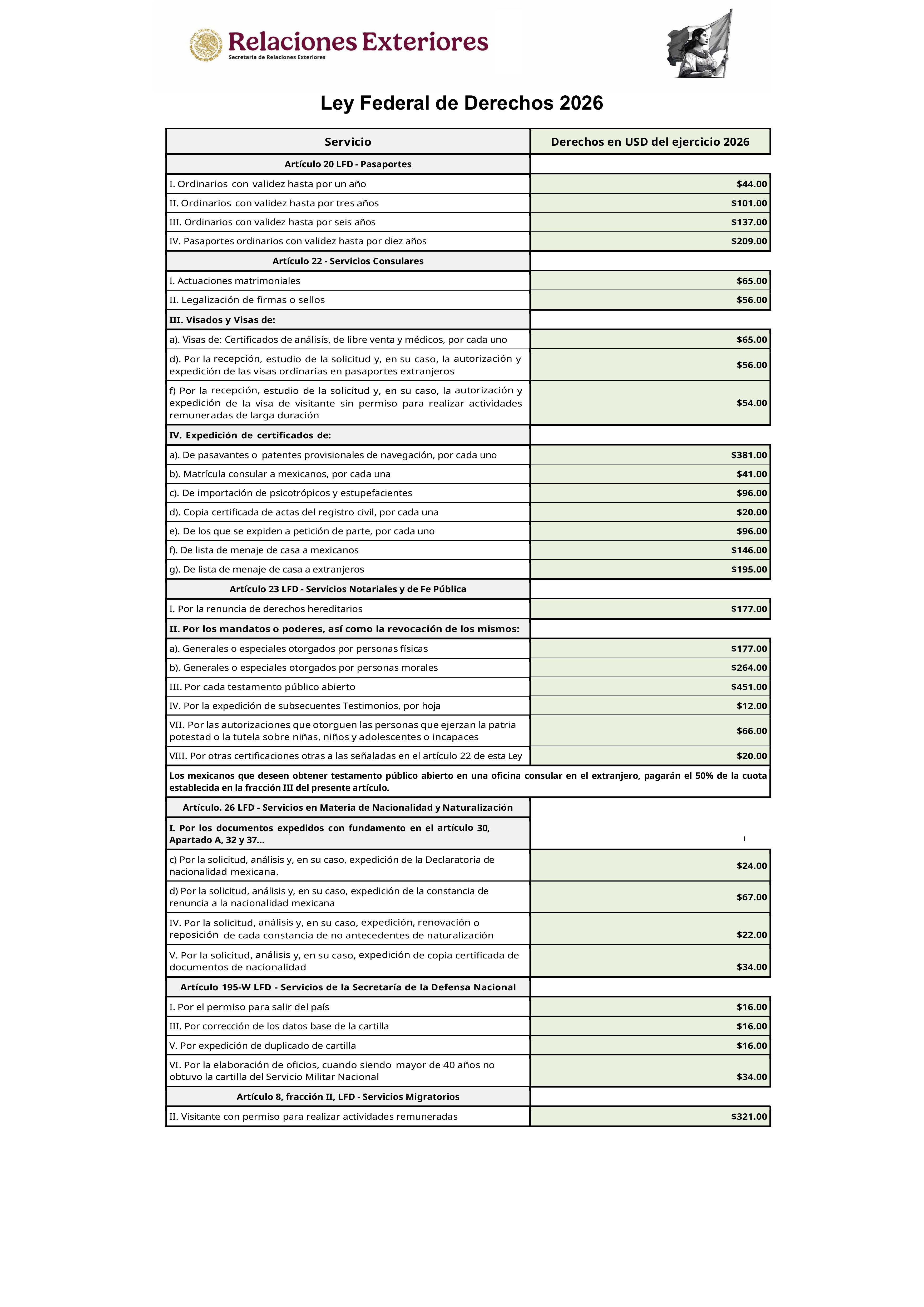Catálogo en proceso de actualización. Los derechos por la expedición del pasaporte serán los comunicados cuando la persona interesada solicite su cita al servicio MI CONSULADO o los proporcionados directamente por la Oficina Consular, conforme al artículo 20 de la Ley Federal de Derechos (LFD) en vigor.