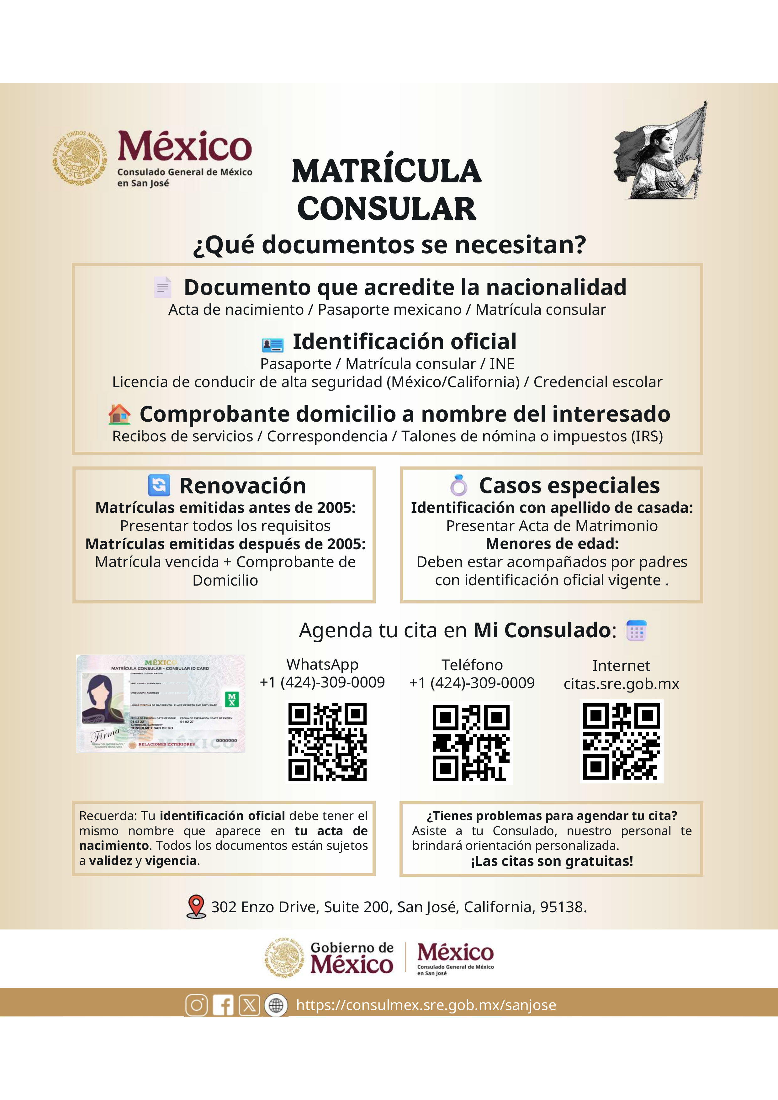 Estimado paisano, antes de acudir a la Oficina Consular, asegúrate de contar con todos los requisitos. Si tienes dudas, revisa el Reglamento de Matrícula Consular, publicado en el Diario Oficial el 12 de mayo de 2005. Su colabración es muy importante para brindarle un servicio eficiente.