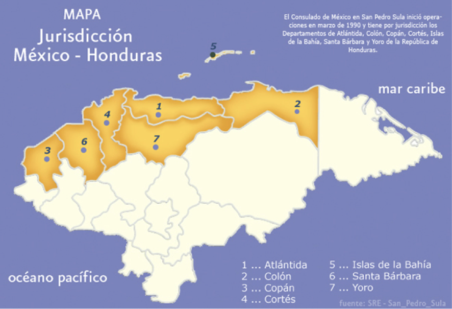 El Consulado de México en San Pedro Sula inició operaciones en marzo de 1990 y tiene por jurisdicción los Departamentos de Atlántida, Colón, Copán, Cortés, Islas de la Bahía, Santa Bárbara y Yoro de la República de Honduras: