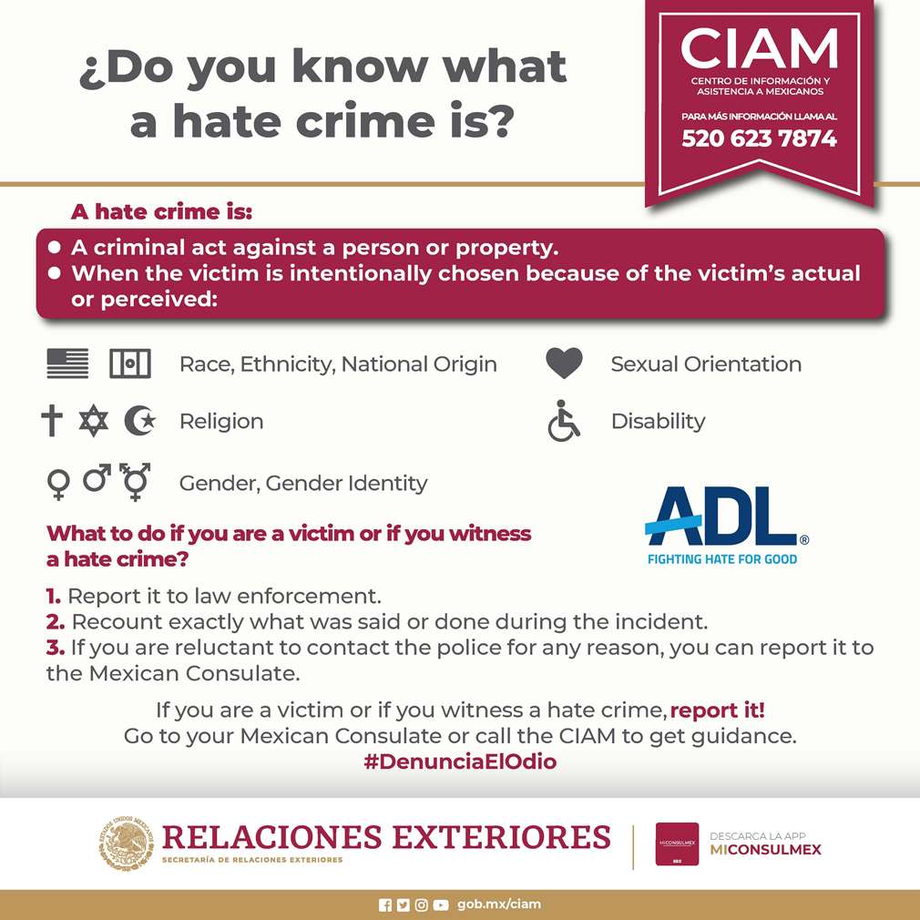 Si eres víctima o testigo de un crimen de odio, ¡denúncialo! Acude a tu consulado de México o llama al CIAM para recibir orientación.