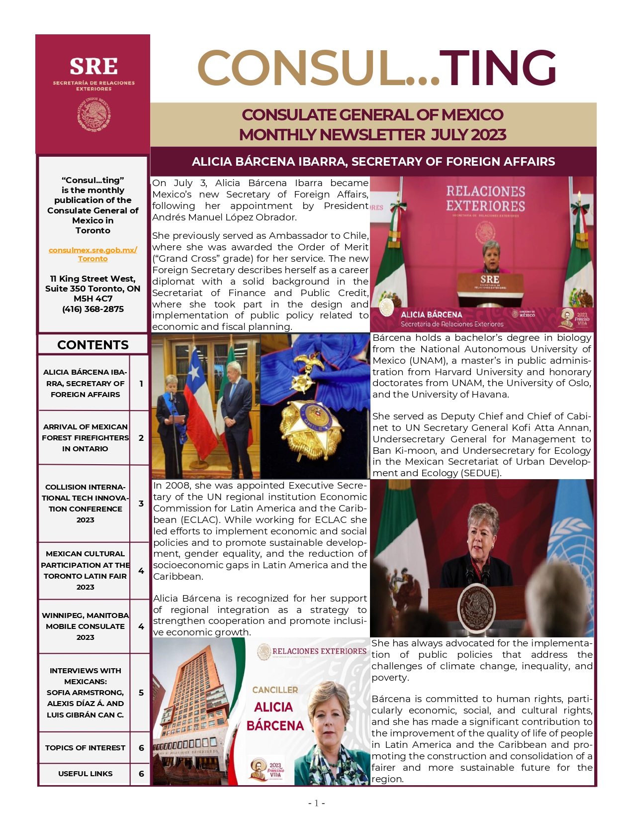 This is the july issue of the newsletter "Consul...ting", from the Consulate General of Mexico in Toronto. This newsletter provides news on the Mexican economy, tourism, and cultural events.