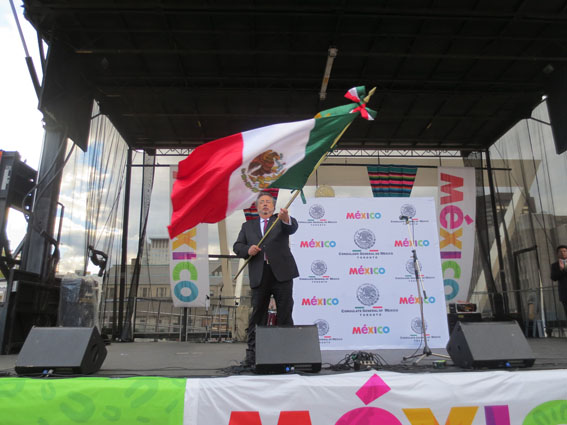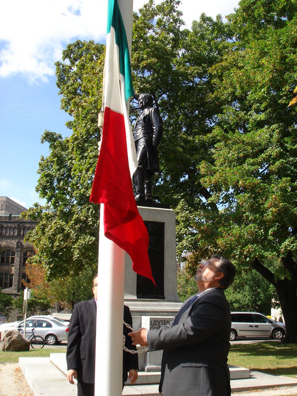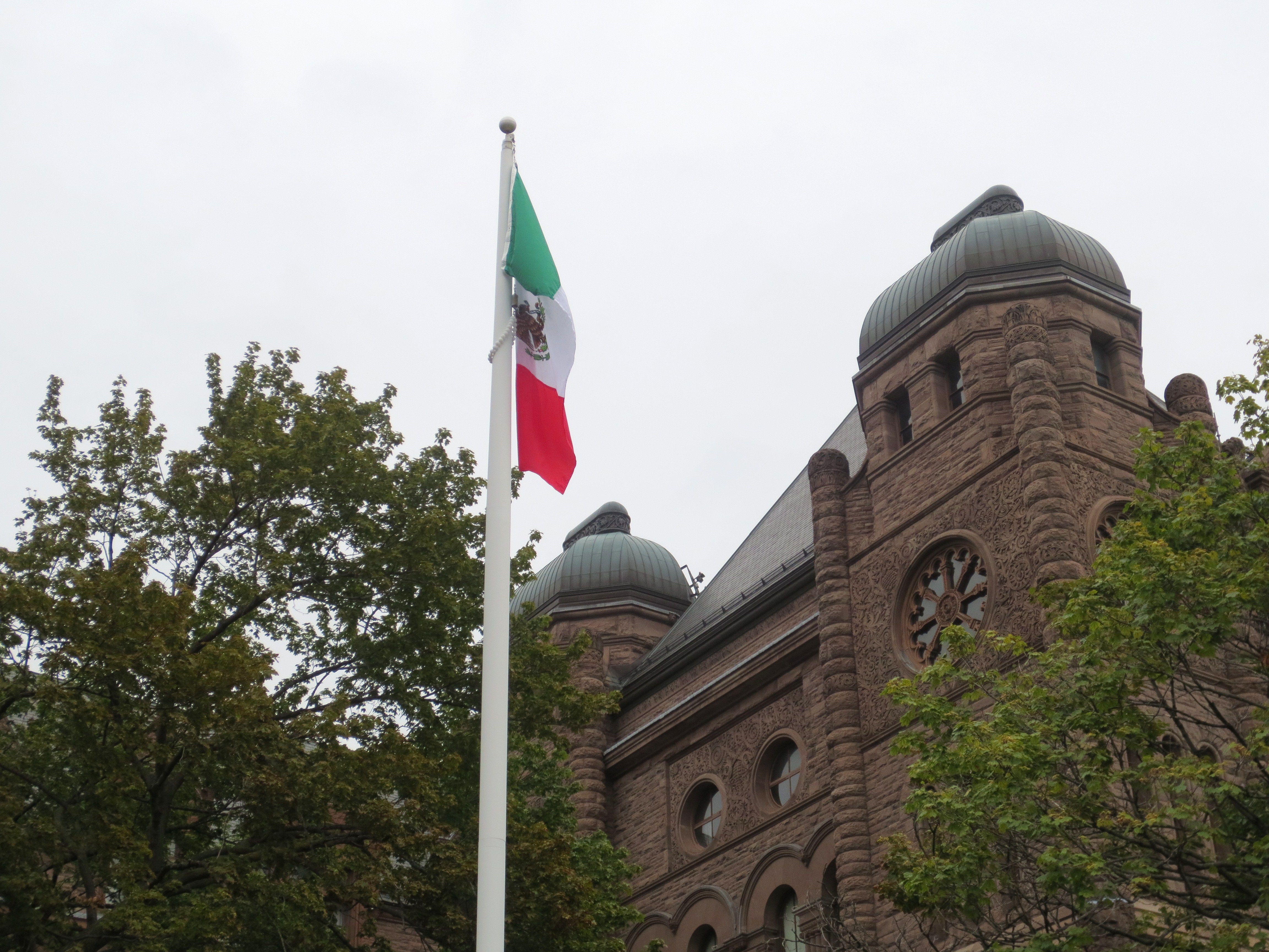 El pasado 14 de septiembre se realizó el izamiento de la bandera de México en el Parlamento de Ontario (Queen´s Park). La ceremonia estuvo presidida por el Cónsul General de México en Toronto, Emb. Mauricio Toussaint, y a ella asistieron personalidades gubernamentales locales, miembros del cuerpo consular en Toronto, académicos, empresarios, periodistas y representantes de la comunidad mexicana.