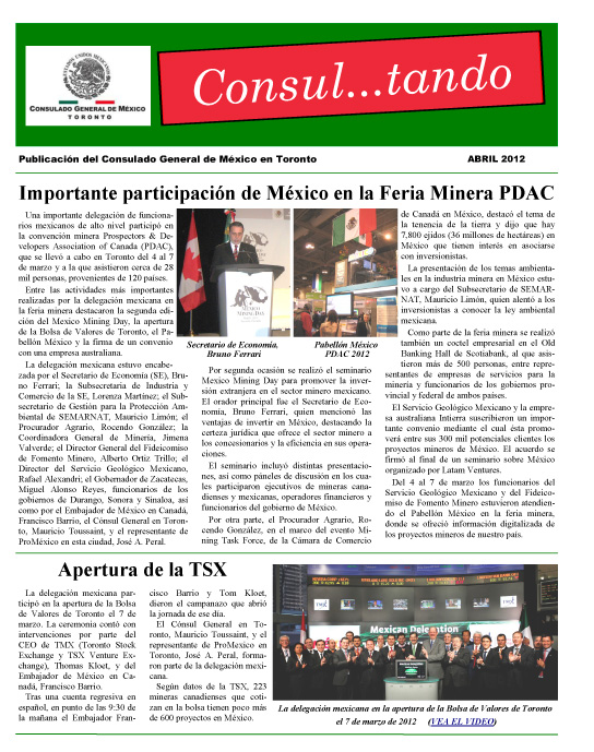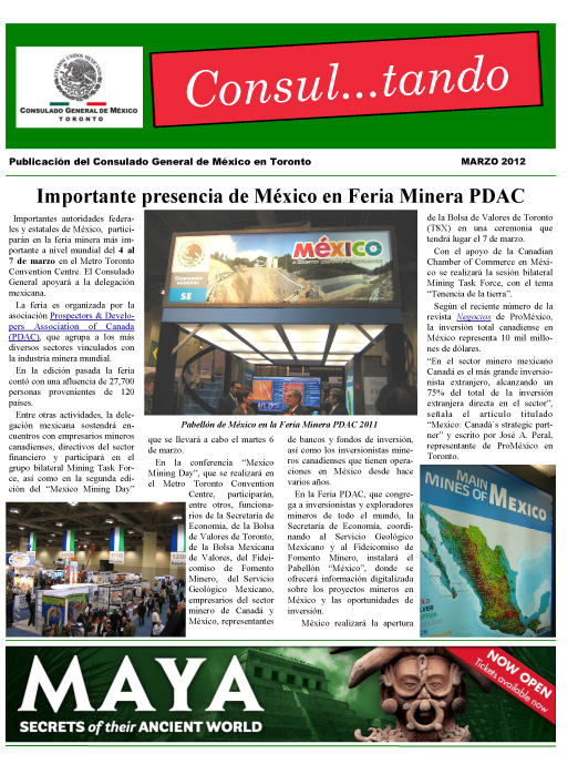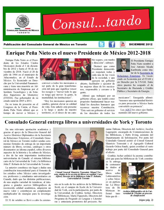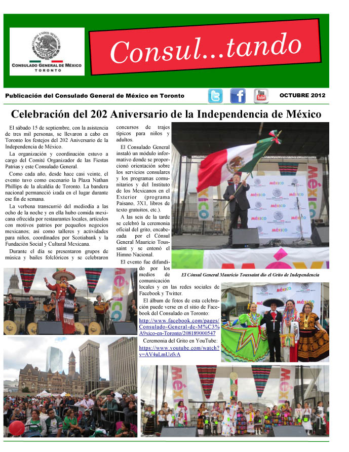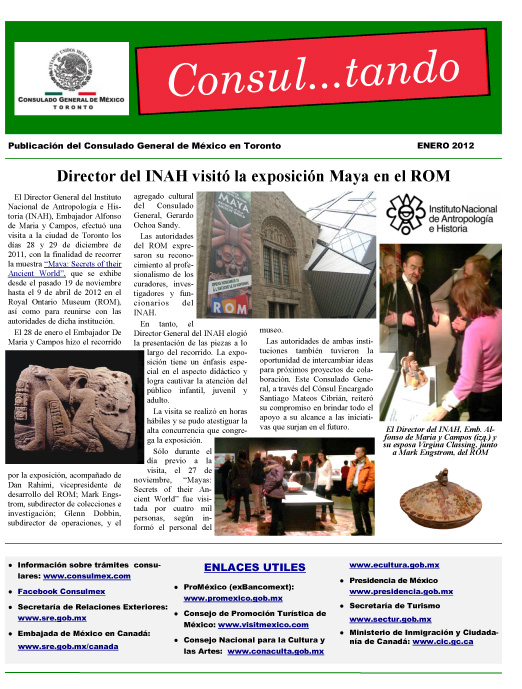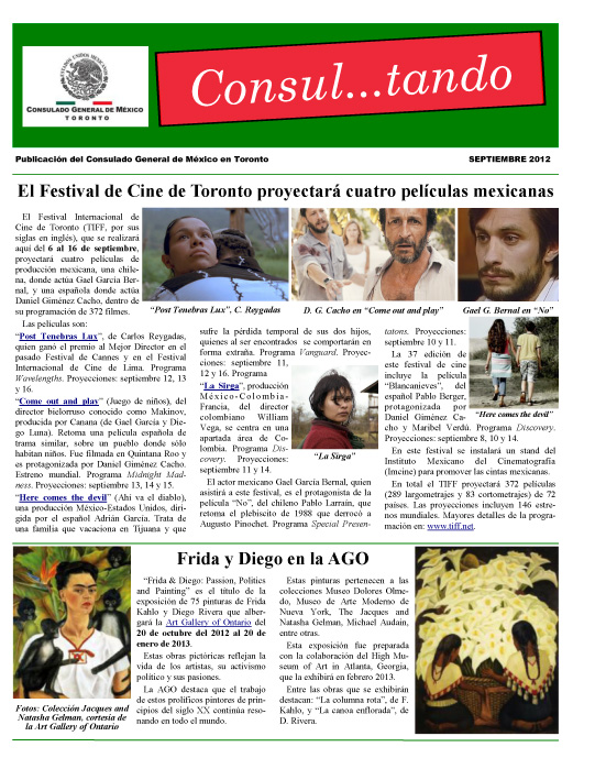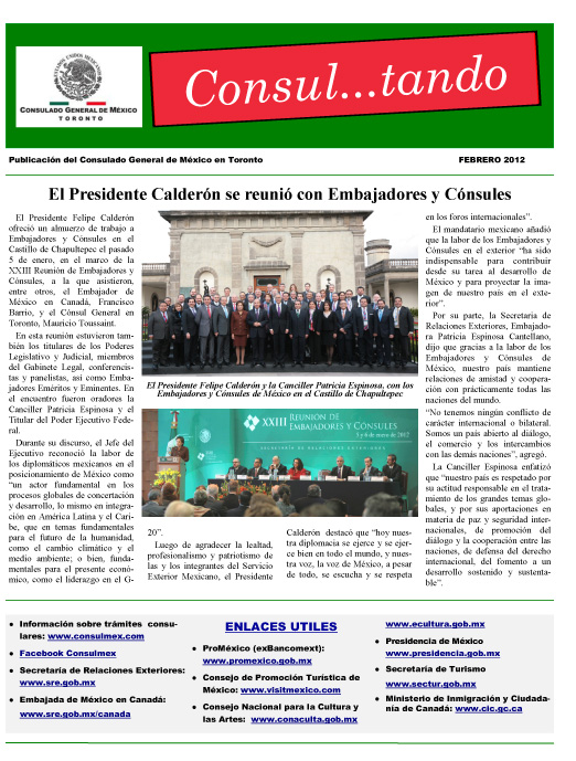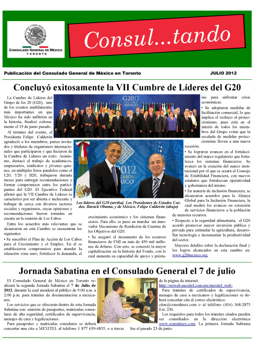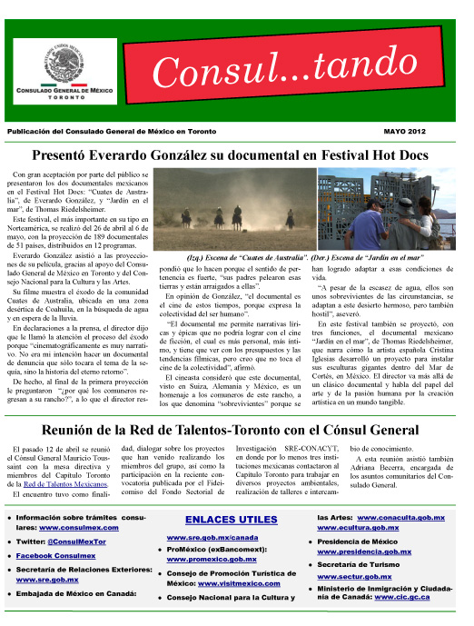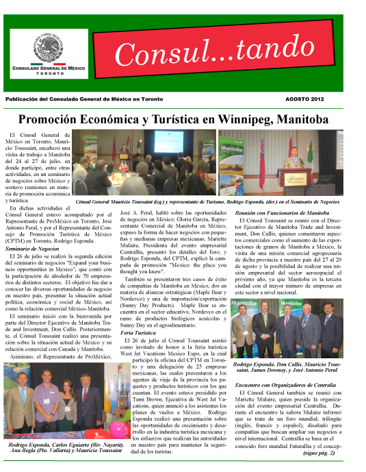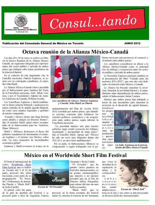 En esta edición: • Encuentro con trabajadores en nueve granjas de Manitoba • Reunión con miembros de la comunidad mexicana en Winnipeg • Jornada Sabatina en el Consulado General el 11 de agosto • Mexicanos ganaron el Iron Chef 2012 en Festival Hot & Spicy • CONACULTA anuncia el Premio Internacional Carlos Fuentes a la Creación Literaria en el Idioma Español • Jornada Informativa del IME • Becas de México para Extranjeros • Servicios consulares durante junio |