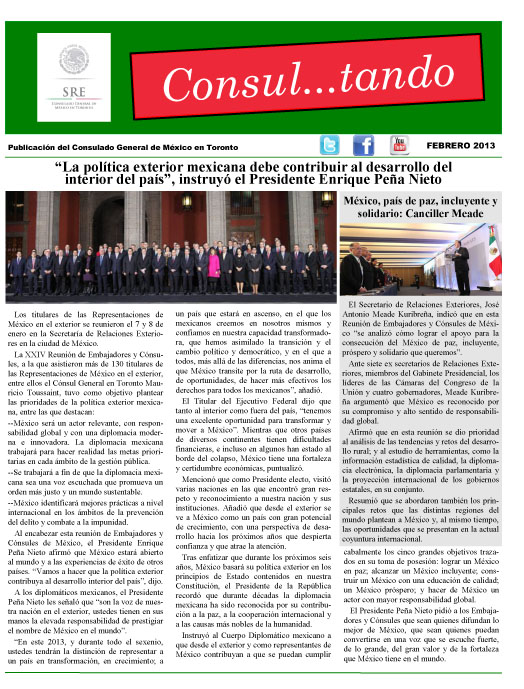 Si se ponen de pie y me lo permiten, procederé a inaugurar formalmente esta importante reunión. Hoy, 7 de enero de 2013, en esta sede de la Secretaría de Relaciones Exteriores, me da mucho gusto inaugurar los trabajos de la Vigésimo Cuarta Reunión de Embajadores y Cónsules de México.