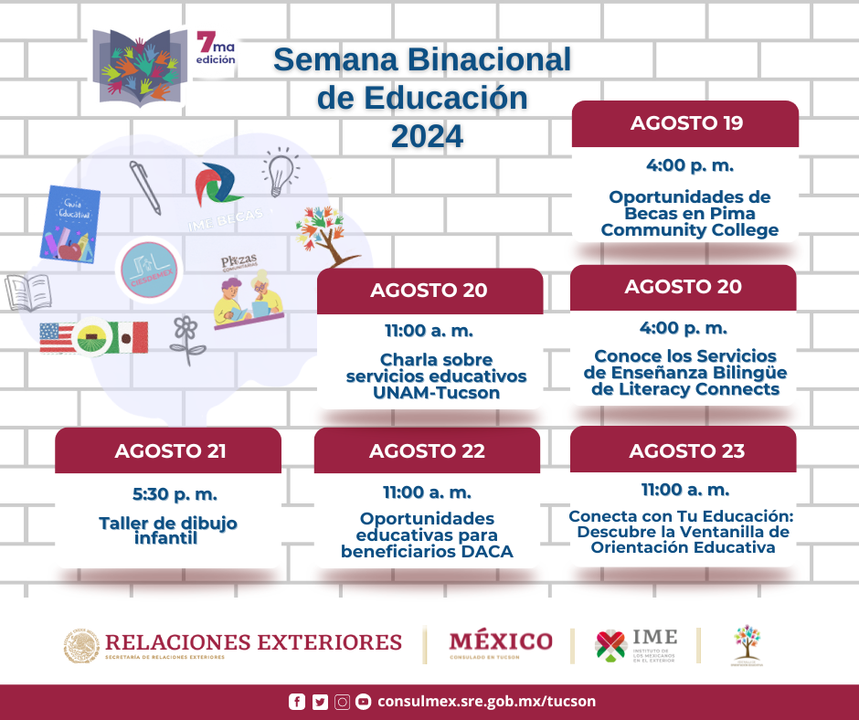 La Semana Binacional de Educación (SBE) del Instituto de los Mexicanos en el Exterior es una campaña anual de difusión que informa y asesora a la comunidad mexicana sobre oportunidades educativas como becas, revalidaciones de estudio, carreras en línea, y la promoción del español y la lectura infantil, entre otros.
