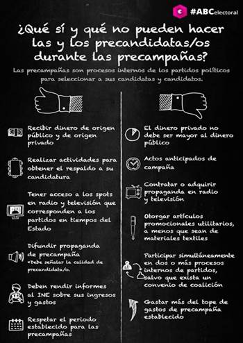 En el marco del Proceso Electoral Federal, el jueves 14 de diciembre de 2017 dio inicio formalmente el periodo de precampañas, en el cual, los partidos políticos nacionales y locales deberán seleccionar a quién de entre sus militantes o simpatizantes van a postular a los distintos cargos de elección. El periodo de precampañas concluye el domingo 11 de febrero de 2018 La selección de candidatos a todos los cargos federales de elección popular, deberá celebrarse a más tardar el día martes 20 de febrero de 2018. |